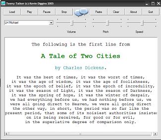 Teeny Talker 1.3 by Kevin Diggins -- A free TEXT-TO-SPEECH program. Lists all the voices installed on your PC. Requires SAPI 5.x API which by the way comes installed on WinXP systems.. Enjoy! |